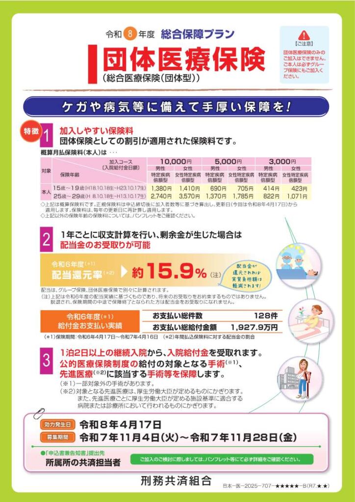 ※1 団体医療保険は、公的医療保険制度に加入している組合員。また、組合員は団体医療保険のみの加入はできません。グループ保険にもご加入ください。